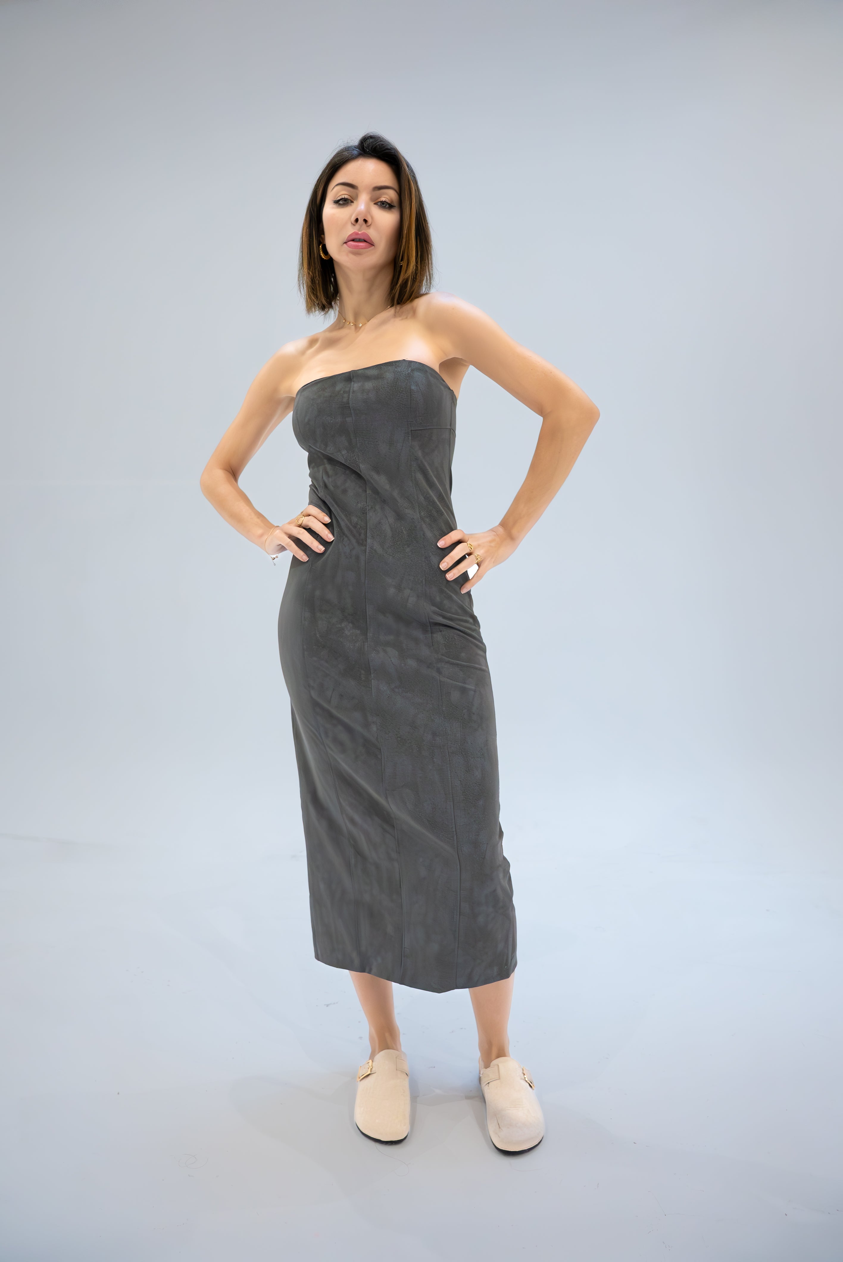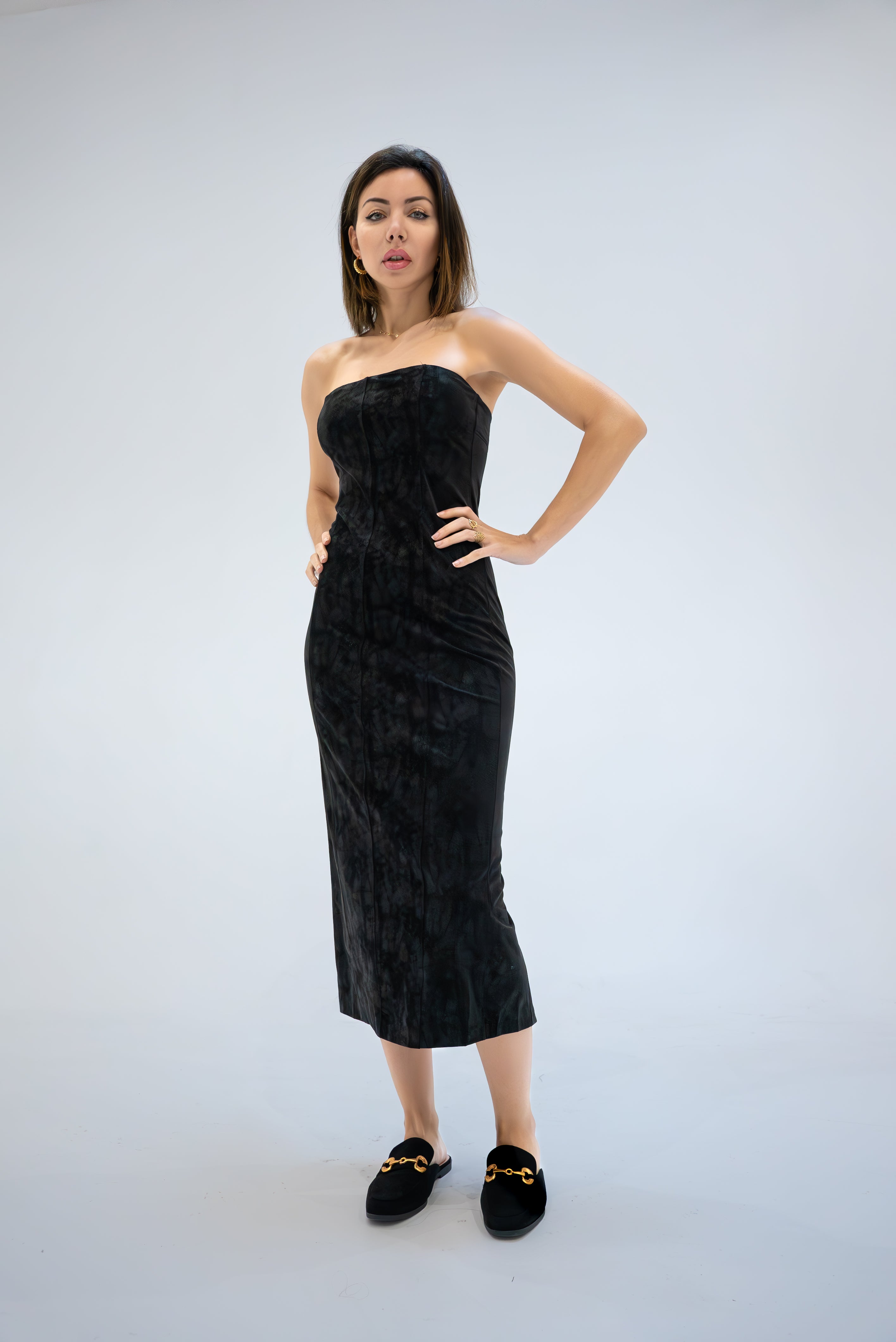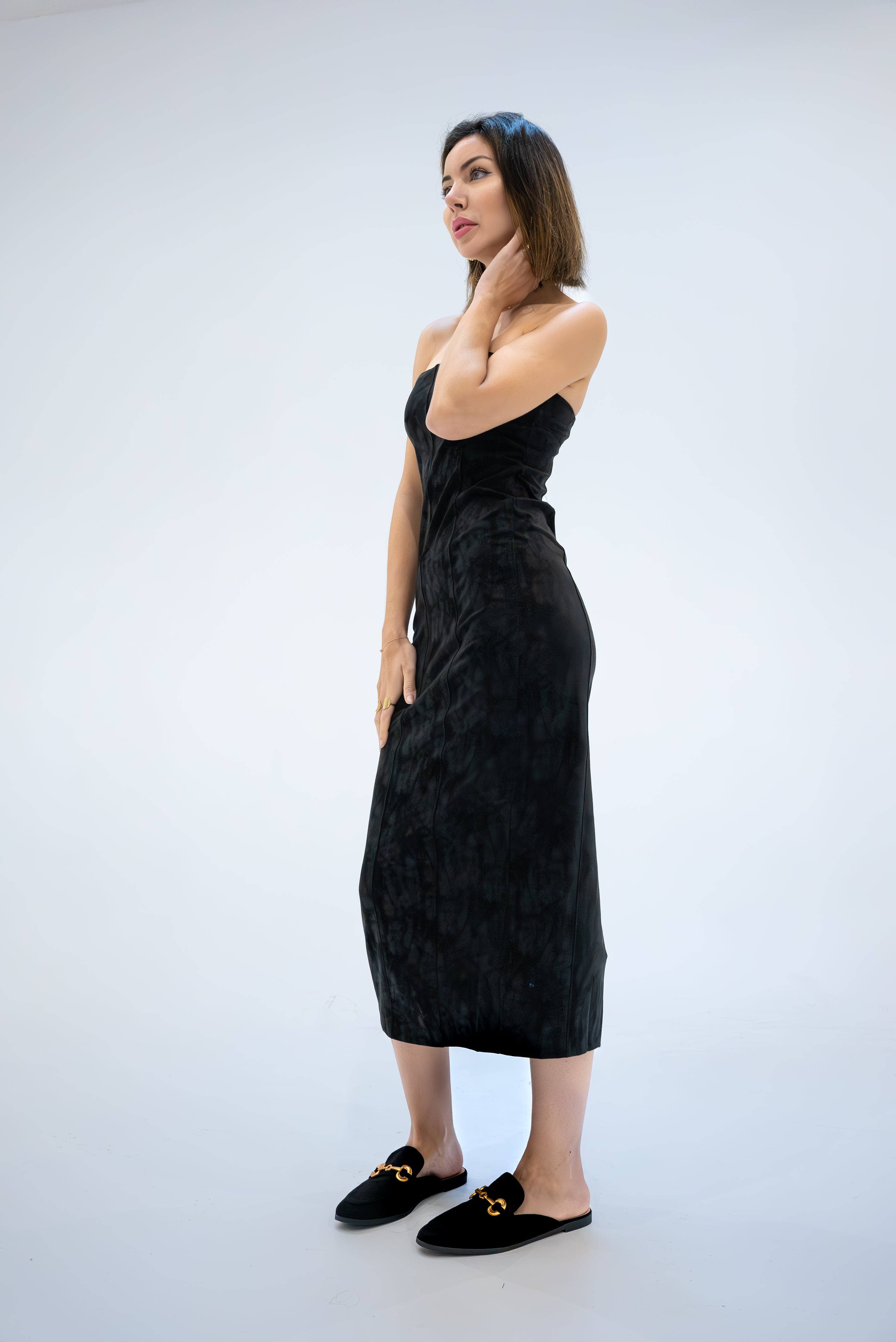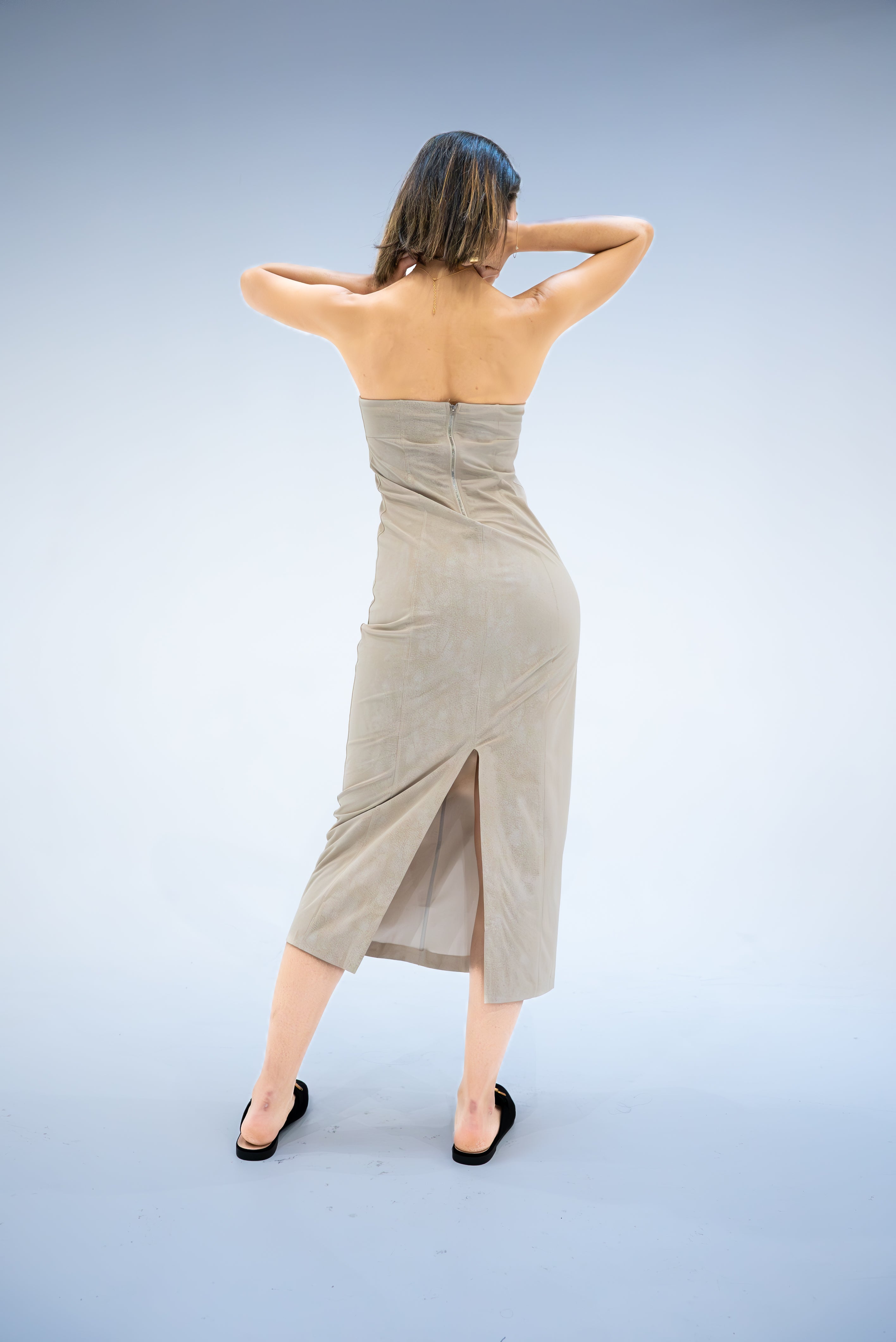 Cette robe bandeau en similicuir redéfinit l'élégance moderne avec sa silhouette audacieuse et son allure sophistiquée. La fermeture éclair à l'arrière assure un ajustement parfait et facile, tandis que la fente arrière offre une liberté de mouvement avec une touche de séduction. Sa coupe près du corps sculpte la silhouette, promettant une apparence à la fois élégante et audacieuse. Parfaite pour les soirées où vous souhaitez faire une déclaration de style, cette robe est un choix audacieux qui ne manquera pas d'impressionner.