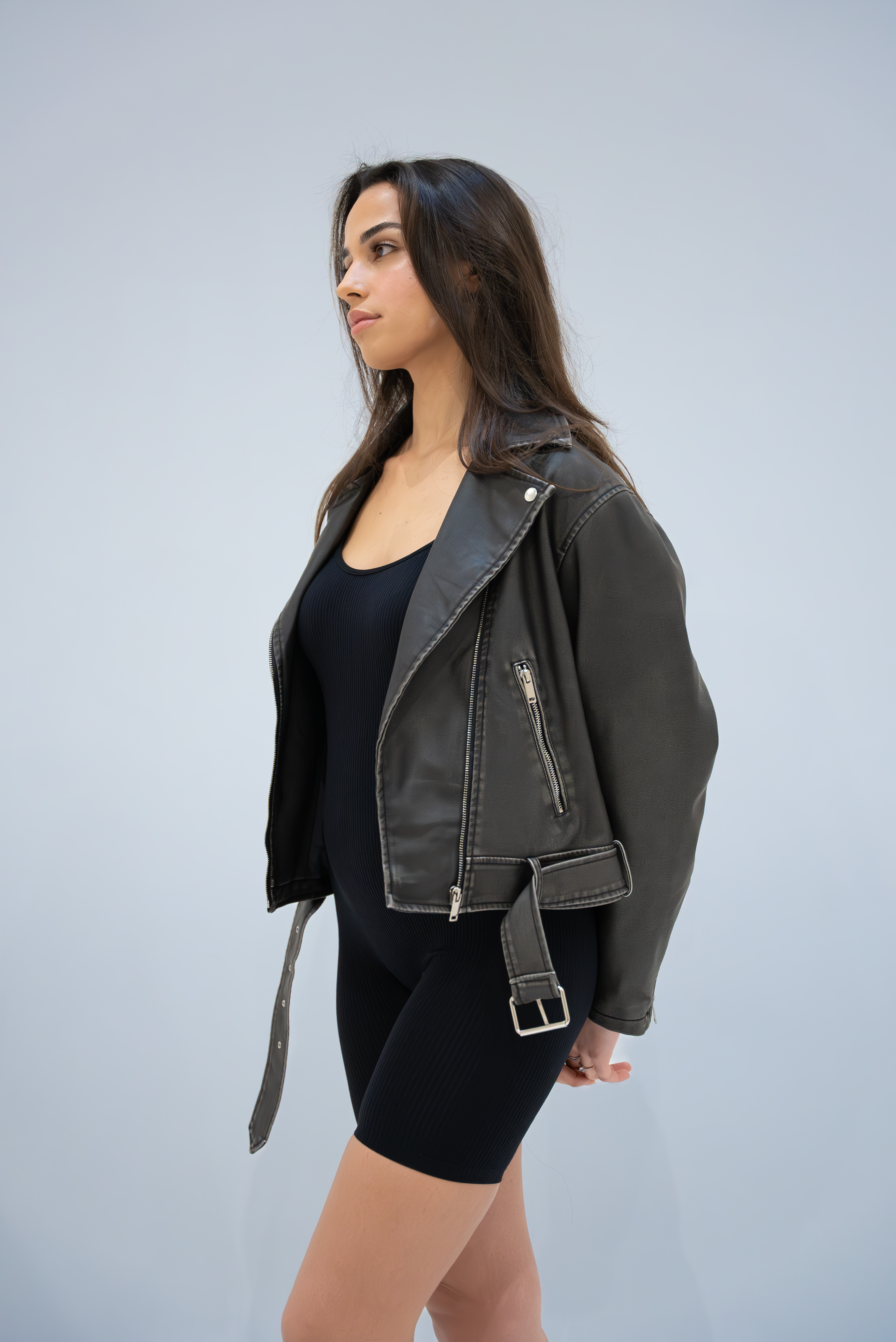 Faux leather jacket with front pockets with metal zippers and a matching belt with a metal buckle for a defined silhouette. The metal front zipper pairs with a lapel collar, adding a touch of sophistication. Also featuring a side zip fastening for a perfect fit, this jacket features a washed effect, giving a vintage and modern look at the same time.